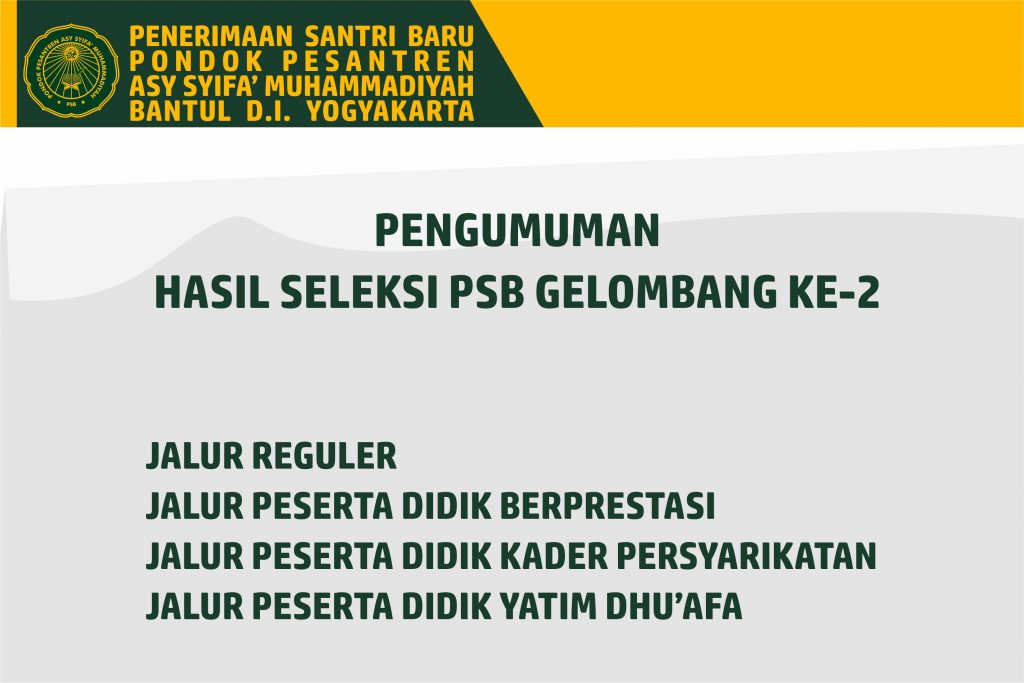 Tahniah dan selamat kepada seluruh calon santri yang telah berhasil lolos pada ujian seleksi gel. ke-2, dan selamat bergabung di Keluarga Besar Pondok Pesantren Asy Syifa’ Muhammadiyah Bantul.