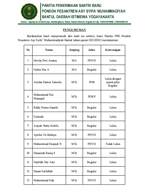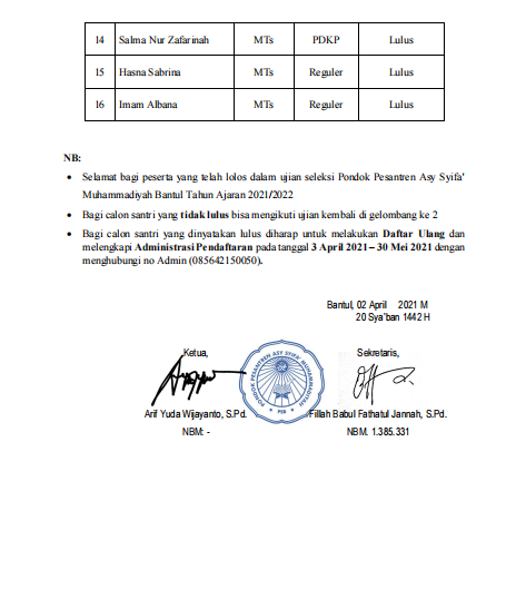 Alhamdulillah ujian seleksi Penerimaan Santri Baru 2021/2022 Pondok Pesantren Asy Syifa’ Muhammadiyah Bantul telah terlaksana pada hari Rabu, 31 Maret 2021. Sekali lagi kami ucapkan selamat kepada santriwan-santriwati, dan selamat bergabung di Keluarga Besar PPAM. untuk daftar ulang dibuka dari tanggal 3 April 2021 – 30 Mei 2021. Syukron