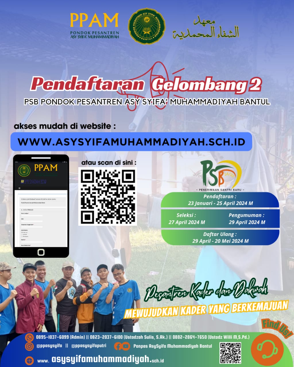 - Next PENGUMUMAN HASIL SELEKSI GELOMBANG 2 PENERIMAAN SANTRI BARU (PSB) PONDOK PESANTREN ASY SYIFA’ MUHAMMADIYAH BANTUL TAHUN PELAJARAN 2024/2025