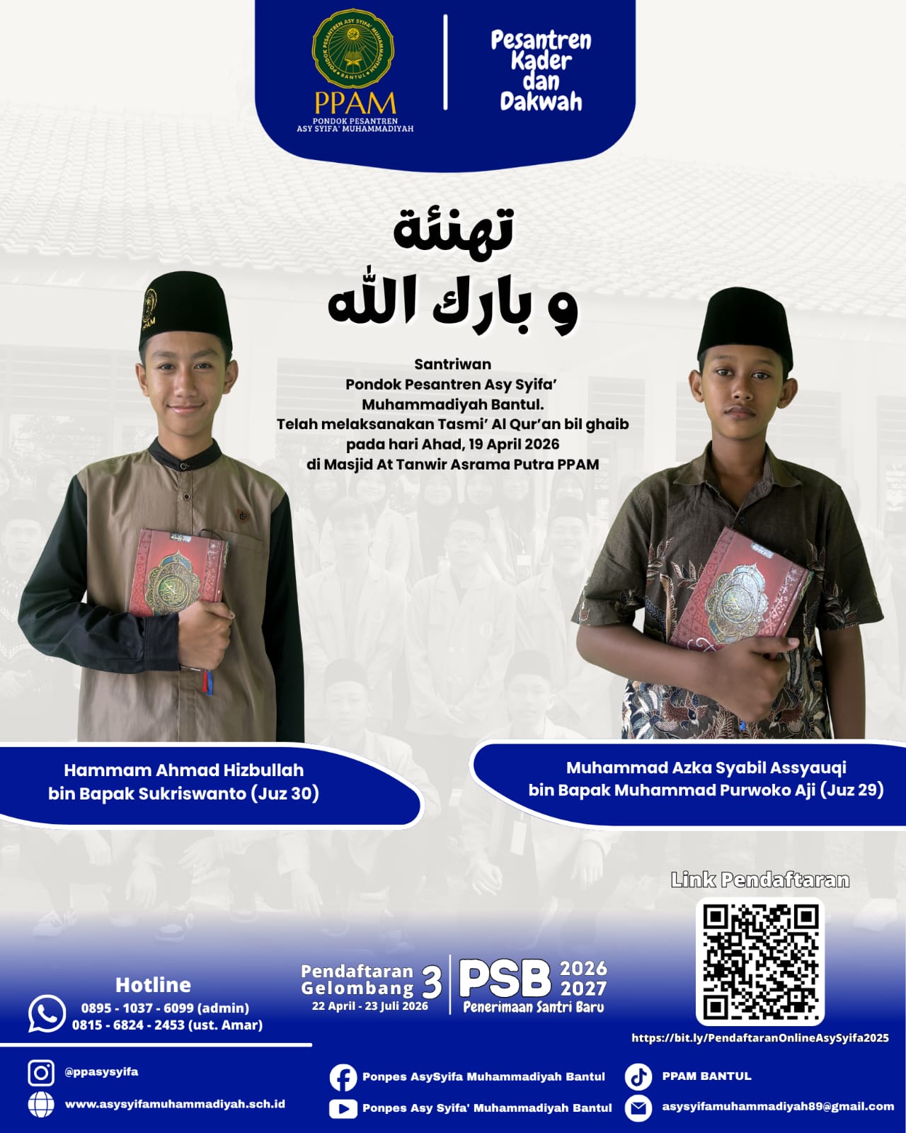 Alhamdulillah, segala puji bagi Allah yang telah memudahkan langkah kebaikan ini. Dengan penuh rasa syukur, kami ucapkan selamat dan barakallah atas terselenggaranya Tasmi’ bil Ghoib Juz 30 oleh Ananda Hammam Ahmad Hizbullah bin Bapak Sukriswanto dan Tasmi’ bil Ghoib Juz 29 oleh Ananda Muhammad Azka Syabil Assyauqi bin Bapak Muhammad Purwoko Aji